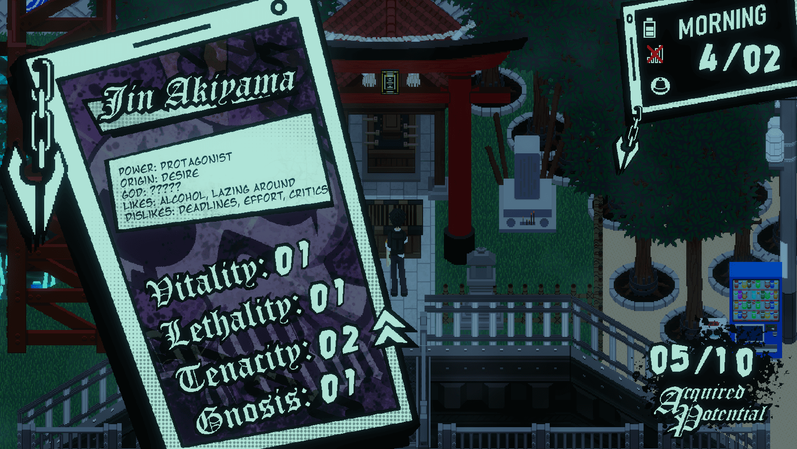 In order to gain points in each of the four main stats the player may daily choose to spend time at specific areas of the game in between main story quests whenever they want. Lethality can be raised at Gold Star Gym, Tenacity at Mega Club, Vitality at the Underground Hospital, and Gnosis can be upgraded via publicity events at Book Down. Once a week you can also place a donation at the shrine for a random stat increase. You can also receive stat points through other storylines and choices throughout the game too. Every day only a subset of these locations are available for you to pick from though so the player will be forced at a minimum to focus on two stats. Our goal is to encourage the player to want to invest in all stats though and one mechanic to encourage that is besides a stat point granting an immediate benefit to health, attack, etc we also want breakpoints to give additional effects to encourage investment into the stat. An example of this is below: