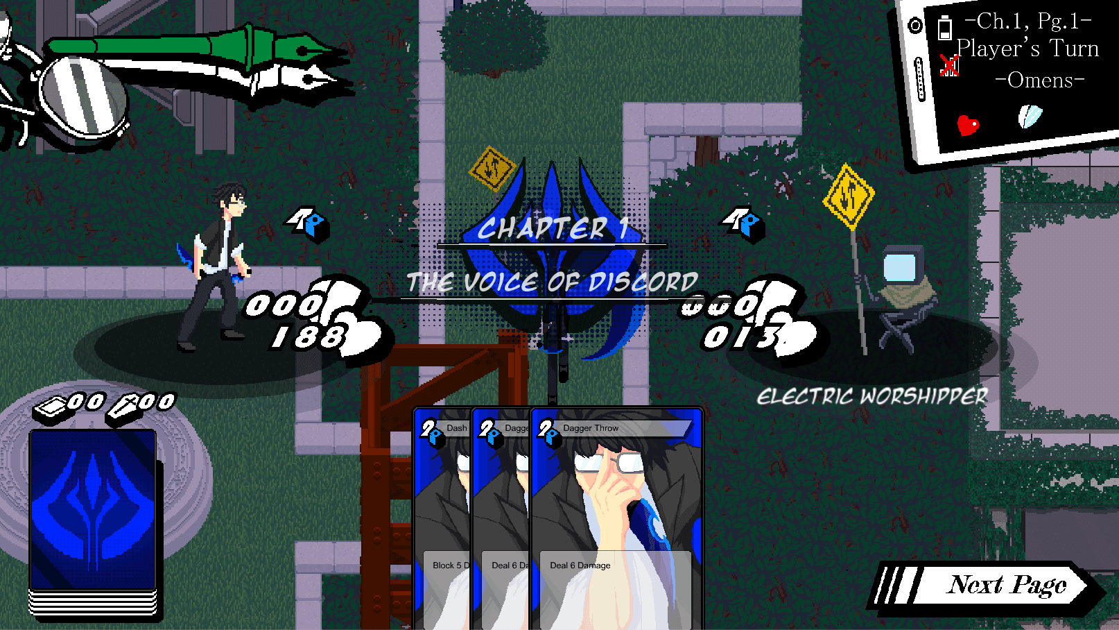 Inside of our dungeon we still want to maintain an action style when it comes to approaching enemies and the dungeon crawling itself. From our old action system we still retain the projectiles, dungeon traps, and ability to take damage outside of the card game combat. We also still allow the player to dash throughout the dungeon. The transition to combat begins when either an enemy successfully hits the player or the player attacks an enemy, after which they transition to the turn-based combat. Both the player and the enemy have their own deck of cards and will draw a full hand at the end of their turn. The enemy’s hand is hidden from the player but the Omens in the top right will reveal the outcome of the cards being played on the next enemy turn. We are still experimenting with the level of abstractness we want behind the Omens mechanic. Current questions include: Should we show their hand, should we reveal only the effects, or should it be a middle ground and show the effects and the numbers associated with those effects As of right now, we’ve opted to show just the effects.